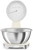 Bilancia da cucina meccanica - portata massima 5 kg. - divisione minima 1 gr. - display analogico - appoggio alimenti ciotola - contenitore/piano acciaio inox 1,8 lt. - struttura in metallo-acciaio inox - colore panna